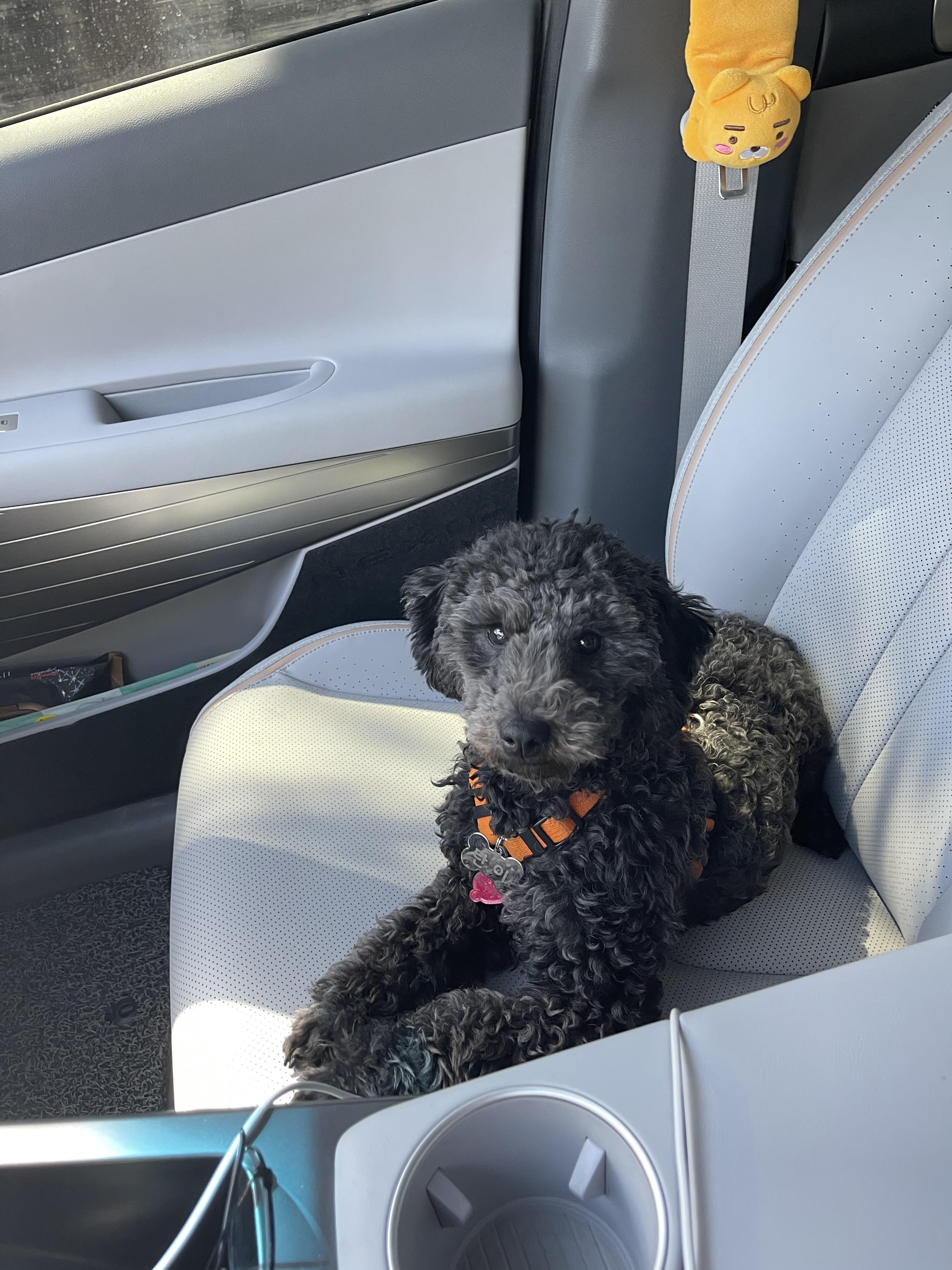울 탄이가 좌석에 앉아서 편안해 합니다.
