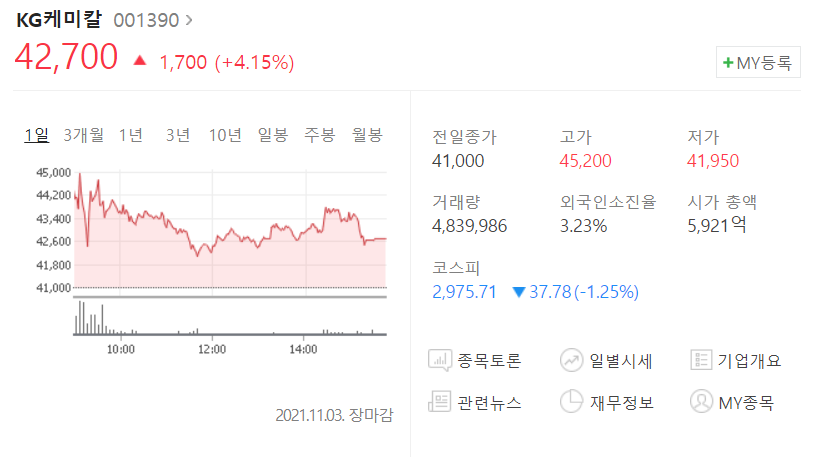 kg케미칼의 경우 장중 45,200원의 고가를 경신했습니다!